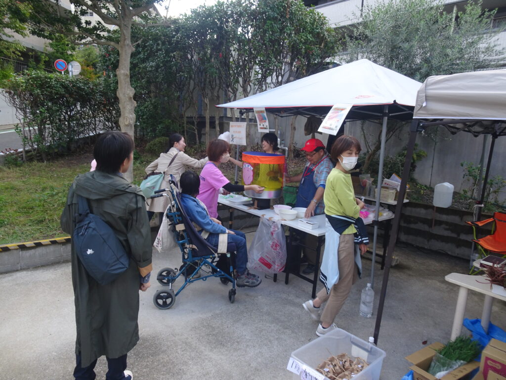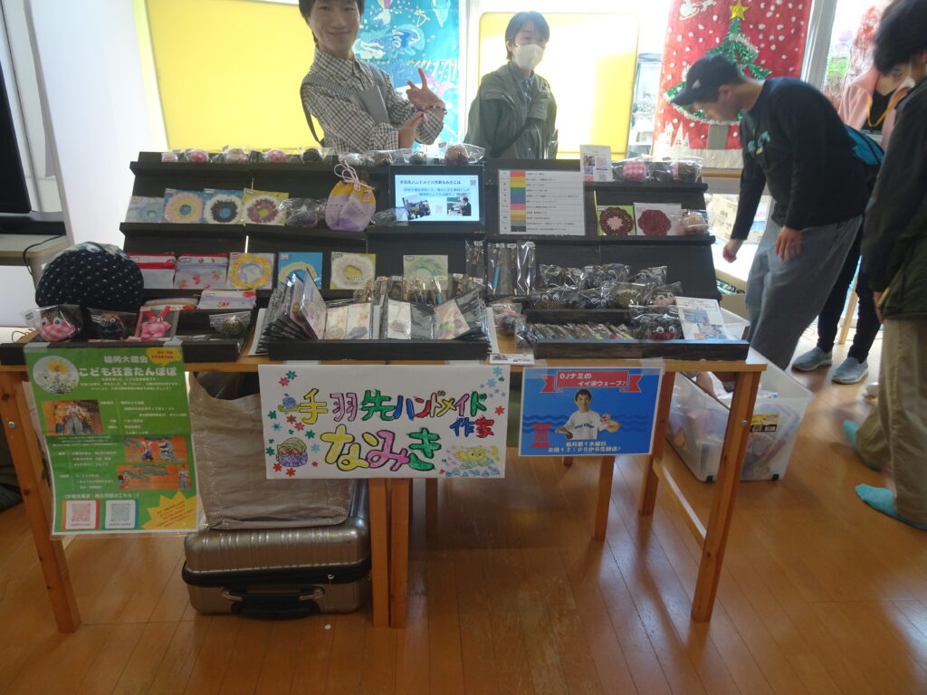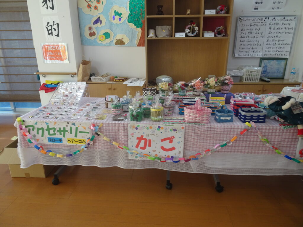 会場ではクックルーオリーブの皆さんが制作したオリジナルのブローチやかごなどのほか、保護者や職員の皆さんに提供いただいたバザー品、糸島市にあるイエローバタフライ合同会社さんが運営するカフェふれんずのクッキーやプリンなどの販売し、大好評でした。