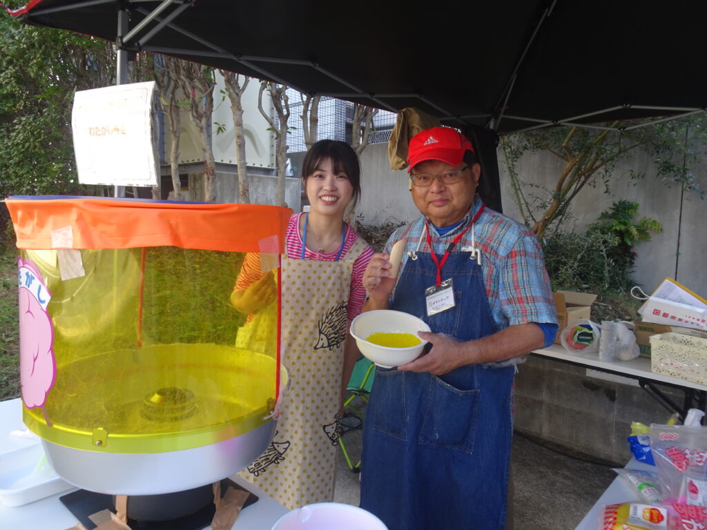また、 今回はボランティアとして、医療法人寺沢病院の事務局長・薗田様が「わたがし」出店にご協力いただき、道具や材料等の準備から、当日の販売まで 全面的にお手伝いいただきました。