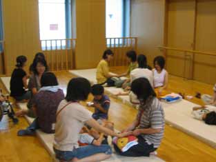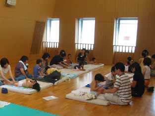 2008年8月10日(日)14:00~16:30 ふくふくプラザの軽運動室で”夏遊び” 第2弾!親子アロママッサージ教室を開催しました。当日は8組の親子、24名の方に参加して頂きました。アロマテラピーアドバイザーの江藤理映子さん(当法人役員)を講師に親子でアロママッサージを楽しみました。 きょうだい児さんも多く、ママやパパはどの子をマッサージしてあげようかと悩む場面もありましたが、ボランティアさんにご協力頂いて、子どもたちみんながアロママッサージを経験することができました。
