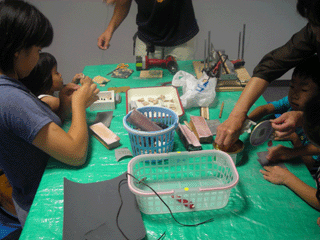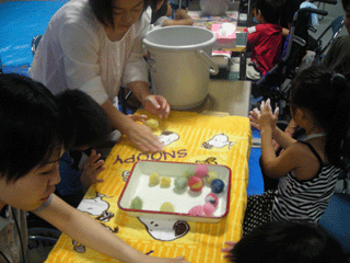 平成21年8月17日(月)にふくふくプラザ交流広場で夏遊び「工作教室」を開催しました。西花畑小学校 特別支援学級の中山哲先生を講師にお迎えして、フェルトボールと木のアクセサリーを作りました。フェルトボールって何だろう?と子どもも大人も興味津々です。羊毛を丸めたものでいろんな色のボールが用意されていました。直径5センチくらいのふわふわボールを石鹸水のなかに浸して、その後に、ころころと転がしていきます。するとどんどん小さく硬くなっていきます。みんな夢中になって転がしていました。いくつも玉を作りそれを紐に通して、ストラップやネックレスの出来上がり!カラフルで素敵な作品になりました。二つ目は、先生が木を、まが玉やさかな、葉っぱなどの形に加工してくださったものをやすりで磨いて、ニスを塗り、ピカピカに仕上げてネックレスなどを作りました。やすりを使うのも初めての子どもも多く、一生懸命に磨いていました。疲れて大人にバトンタッチしている子もいました(^^ゞ今回は、ついつい大人も夢中になって作品作りに没頭してしまいました。改めて、物を作るって楽しいなぁと実感しました。きっと、子どもたちも物を作る楽しさや達成感を感じてくれたはず!?