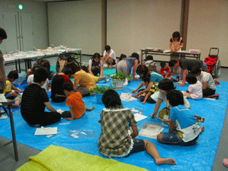 8月9日(日)にふくふくプラザ交流広場で夏遊び「藍染(たたき染め)で、オリジナルグッズをつくろう!」を開催しました。上原さん、神原さん、松井さん(当法人役員)を講師にたたき染めのバッグを作りました。藍の葉っぱを見るのは初めての子どもたちは、この葉っぱで本当に染まるのかちょっと不安そうな表情でした。でも、いざ始まると藍の葉をちぎってどんなデザインにしようか?とママやパパに相談する姿もありました。藍の他にも絵の具も用意されて、いていろんなデザインを考えて自分らしいバッグを完成させようと頑張っていました。バッグつくりが終わった後は、浮き輪くぐりゲームを2つのチームに別れて行いました。本当は1回で終わるはずだったのですが、「お願いします!もう一回やらせて下さい!」の言葉にもう一勝負…。でも勝ったチームにも、負けたチームにもキャンディーのネックレスがプレゼントされました(^^)
